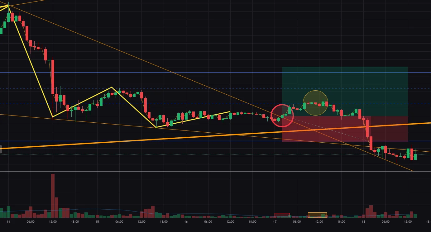 당시 폴링 웻지 패턴이라 판단했고, 또 상승추세에 가까운 만큼, 폴링 웻지 상단을 상방 이탈하면 상승이라고 생각해 롱 포지션 진입했습니다.