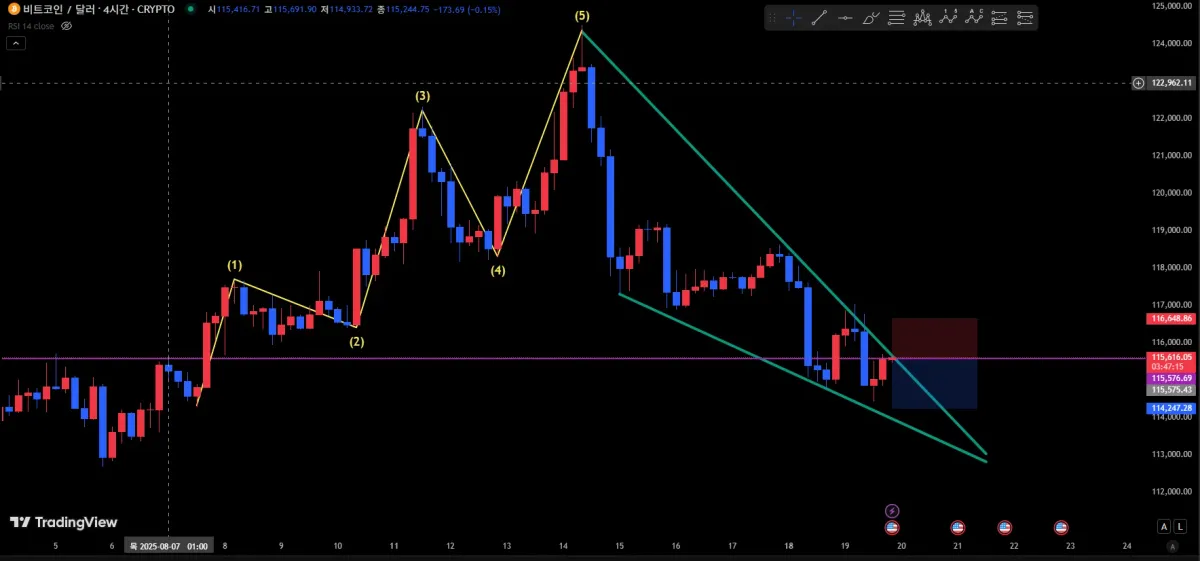 5 파동 이후 하락이 일어나는 중 웻지 패턴이 발생한 것 같다 판단했고, 수렴을 할 가능성이 있다 생각하여 진입을 시작했습니다.