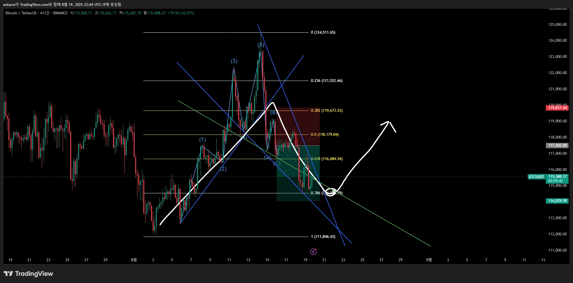 상승형 5파동 이후 조정abc파가 나올것이라 예상 이후 c봉이 a봉을 지나 내려가려할 때 매수