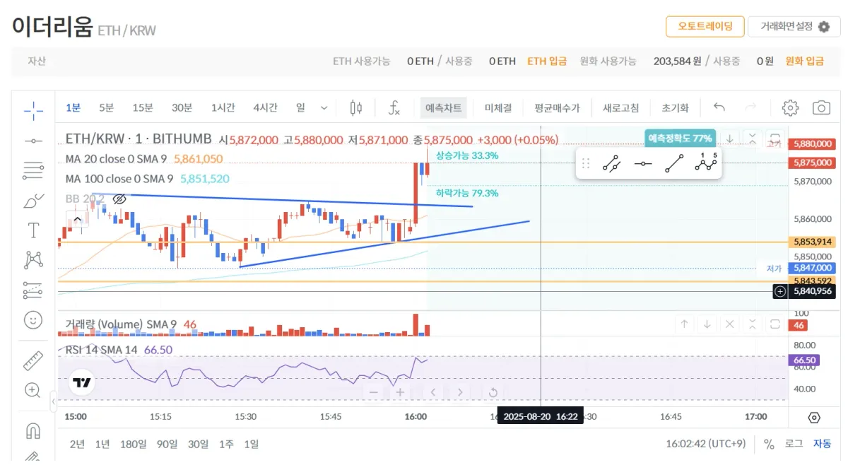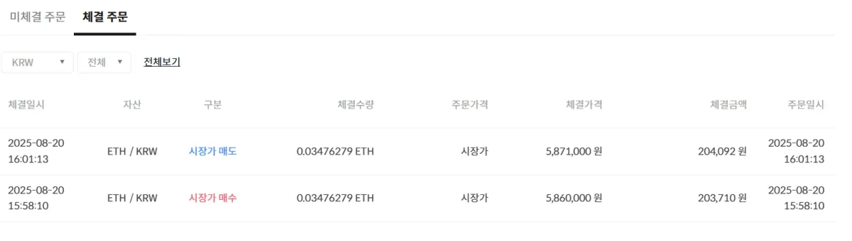 진입근거: 삼각수렴 형태에서 지지선을 하방돌파 하려다 매수량이 늘어나는 것을 봤음, 그렇지만 확신이 없어서 지켜보다가 5860000원에 상승할거라고 확신을 가지고 진입, 매수량이 급격하게 많아지고 저항선 돌파, 첫 실전투자라 욕심이 났지만 안전하게 익절.