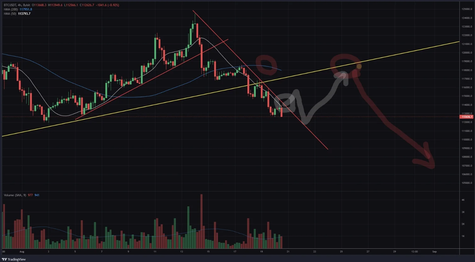 그러나 50일과 200일 이평선이 모두 하향 변곡을 하고 있고, 이미 4시간봉의 추세가 1일 상승추세선을 하향 돌파하였으므로,