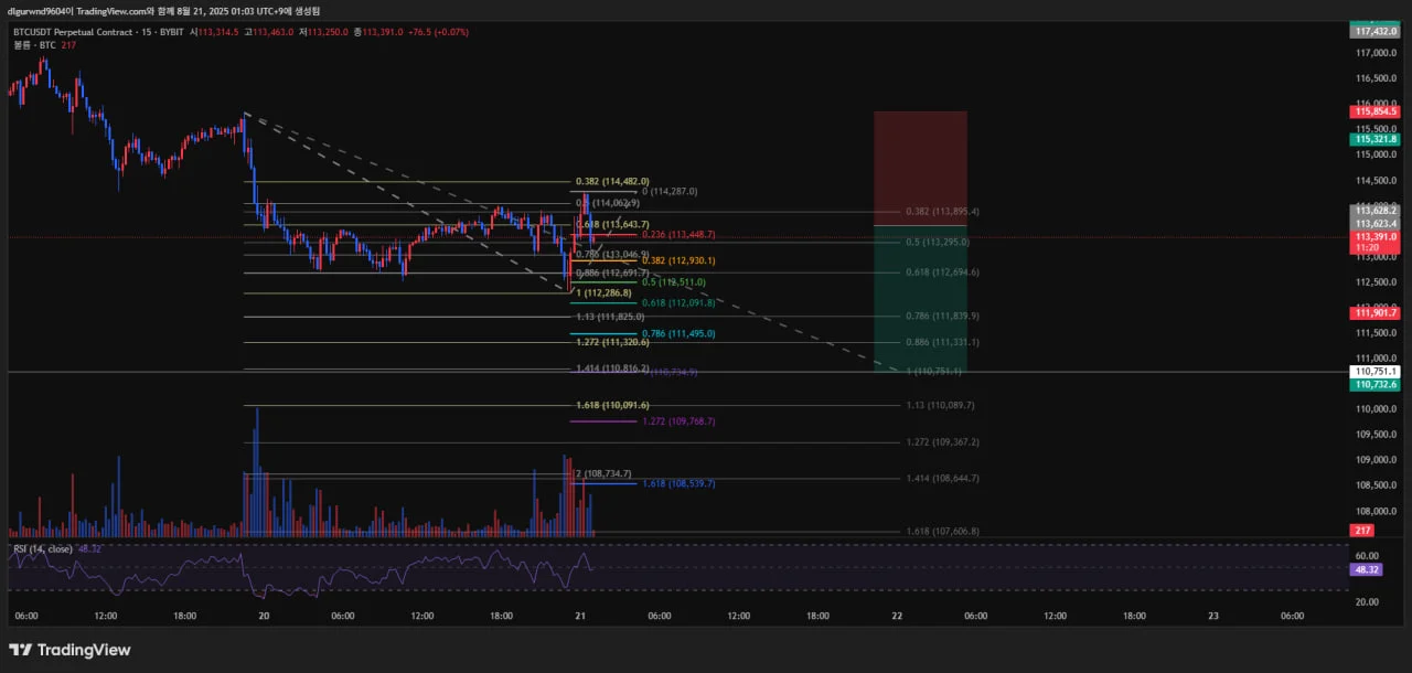 2) 원래는 114,287에 들어가고 싶었는데, 작도하다보니 가격이 내려가서 0.618 부근 매매 진행