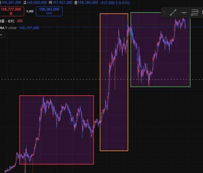 다우 이론에서는 투자 시장의 순환 과정 6단계에 대하여 공부하였습니다. 이는 매집-상승-과열-분산-공포-침체의 순환이며 현재 비트코인 상황에서 바라본다면 빨간색 부분이 매집, 노란색 부분이 상승, 초록색 부분(현재)가 과열 시기라고 생각합니다. 과열 시기가 언제까지 지속될지는 알 수 없으며 후에는 분산-공포-침체의 싸이클이 나타날 가능성이 높다고 볼 수 있습니다. 매도세가 보인다면 숏에 배팅하는 것도 괜찮은 선택이라고 생각합니다.