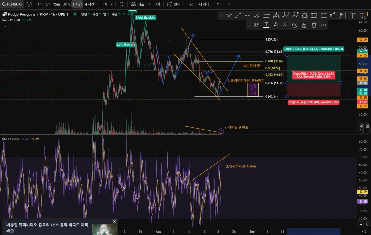 1.폴리엣지 패턴으로 반등 지지를 받고 올라갔다가 지지저항자리에서 약간 하락하지만 반등예상으로 보입니다.