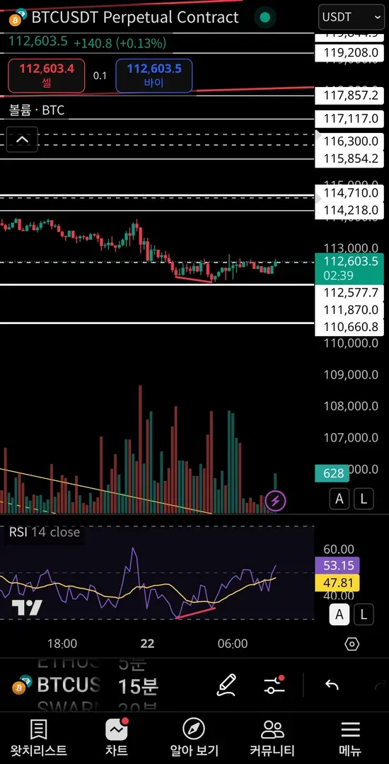 오늘 기준 단기적 관점으로 봤을때, 현재 rsi 상승다이버전스 출현했습니다.