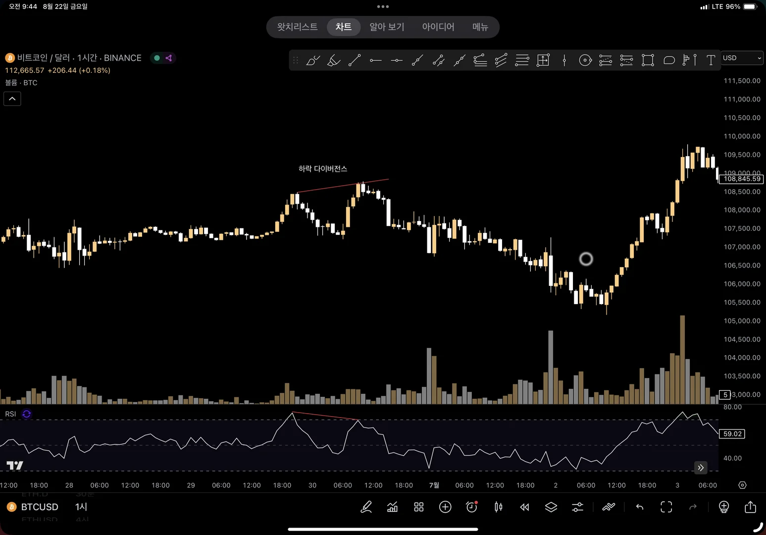 RSI 지표 추가하여, 하락/상승 다이버전스 확인했습니다.