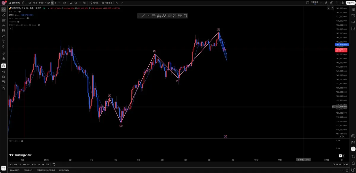 [25/03/10 ~ 25/08/13] 구간에 1-2-3-4-5 엘리어트 파동을 작도하고, 앞으로 a-b-c 파동이 나오지 않을 까 예측을 했습니다.
