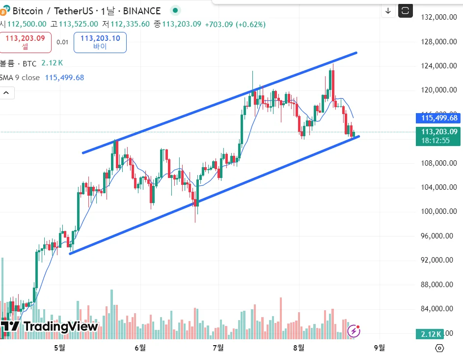 상승 추세에 있고, 위아래 추세선이 저항선과 지지선의 역할을 하고 있는 것으로 보임.