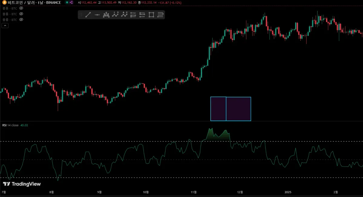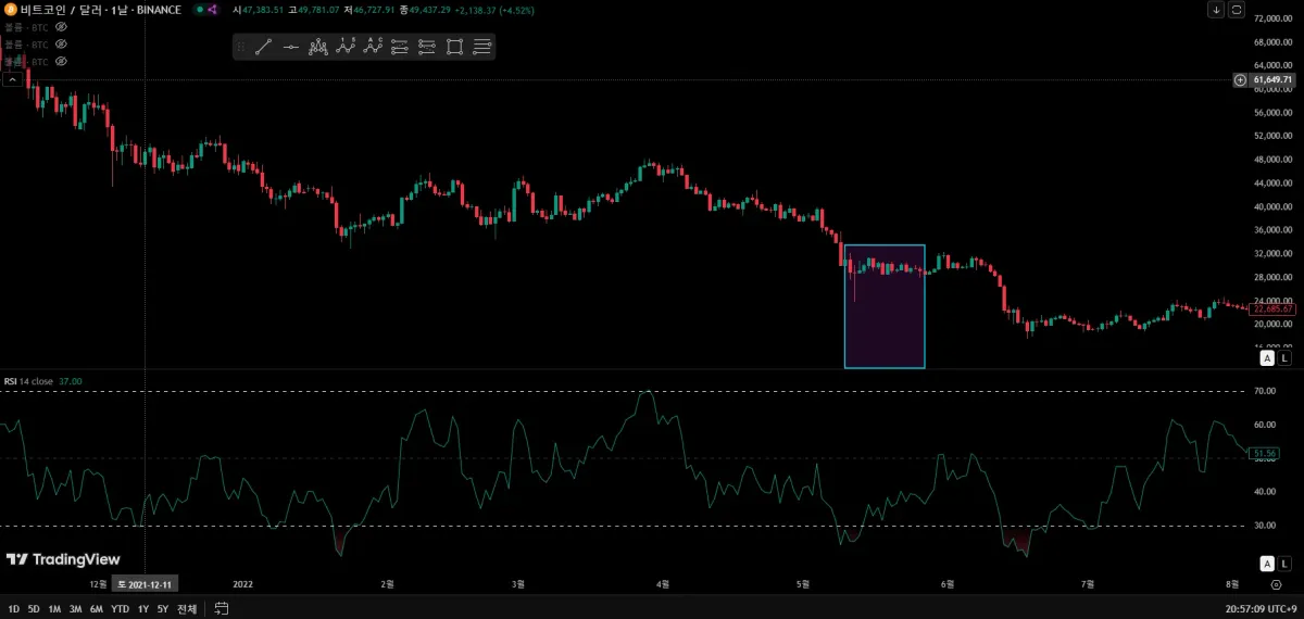 해당 그래프에서 사각형 속 구간 가격은 횡보하고 있지만 RSI 수치가 지속적으로 상승하고 있는 다이버전스가 발생하고 있음을 알 수 있습니다.