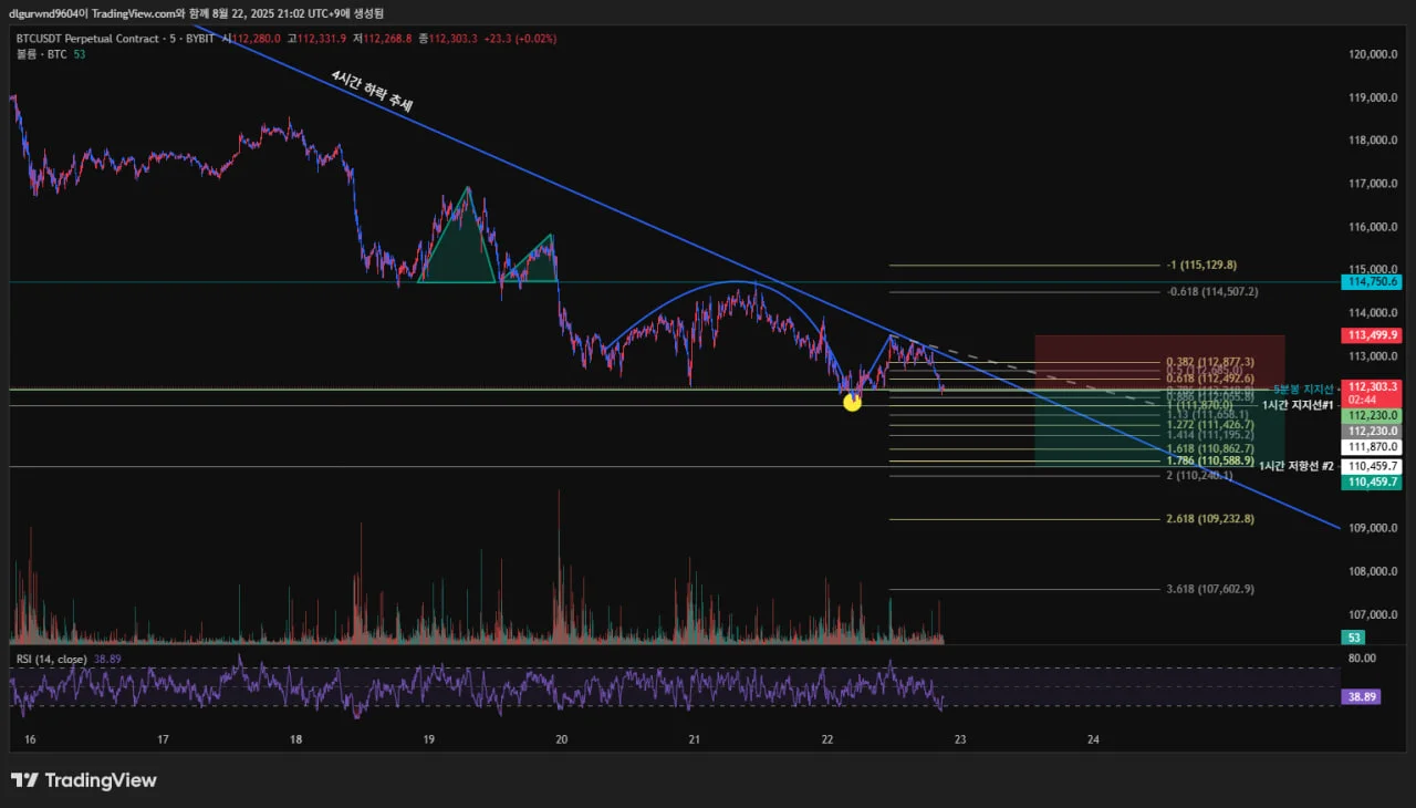 5) 5분봉에서 단기적으로 지지선을 해준 112230에서 저항의 역할로 전환된다면 해당 가격대에 진입