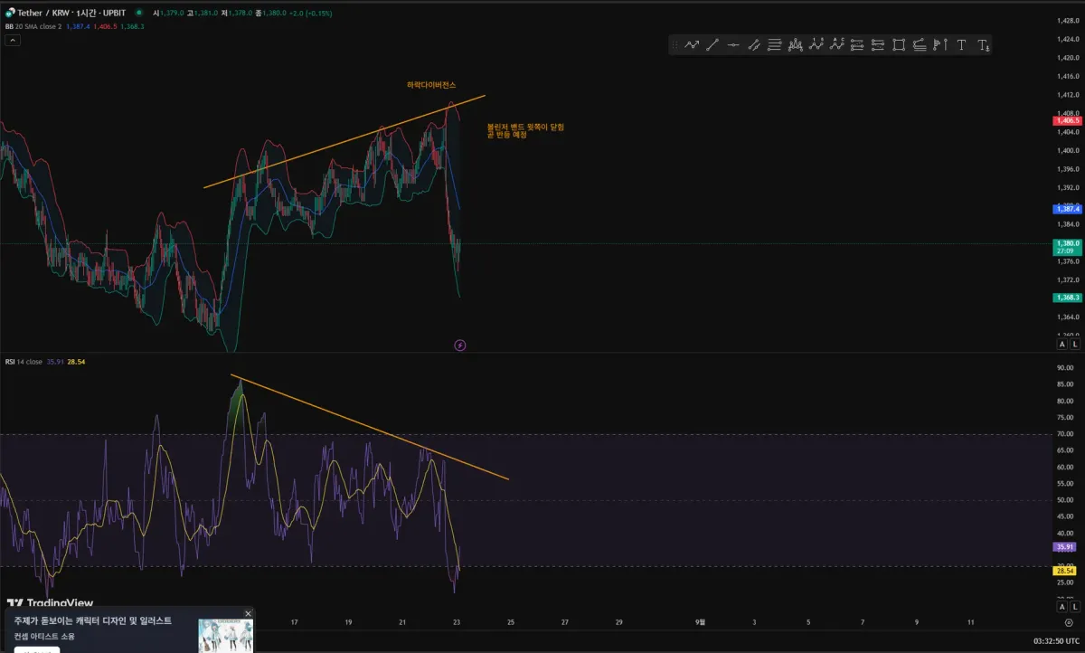 하락 다이버전스가 발생했으나 볼린저 밴드를 봤을때 윗부분이 닫힌걸 보아 하락했지만 약간의 반등이 나올것이 보입니다.