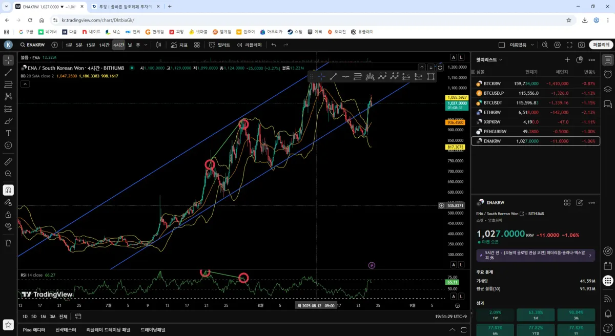 ENA bithumb 4시간봉입니다. 보조지표인 상대강도지수가 하락하고 있는 것에 반하여 주가의 고점은 계속 높아지는 hh패턴을 보이고 있습니다.