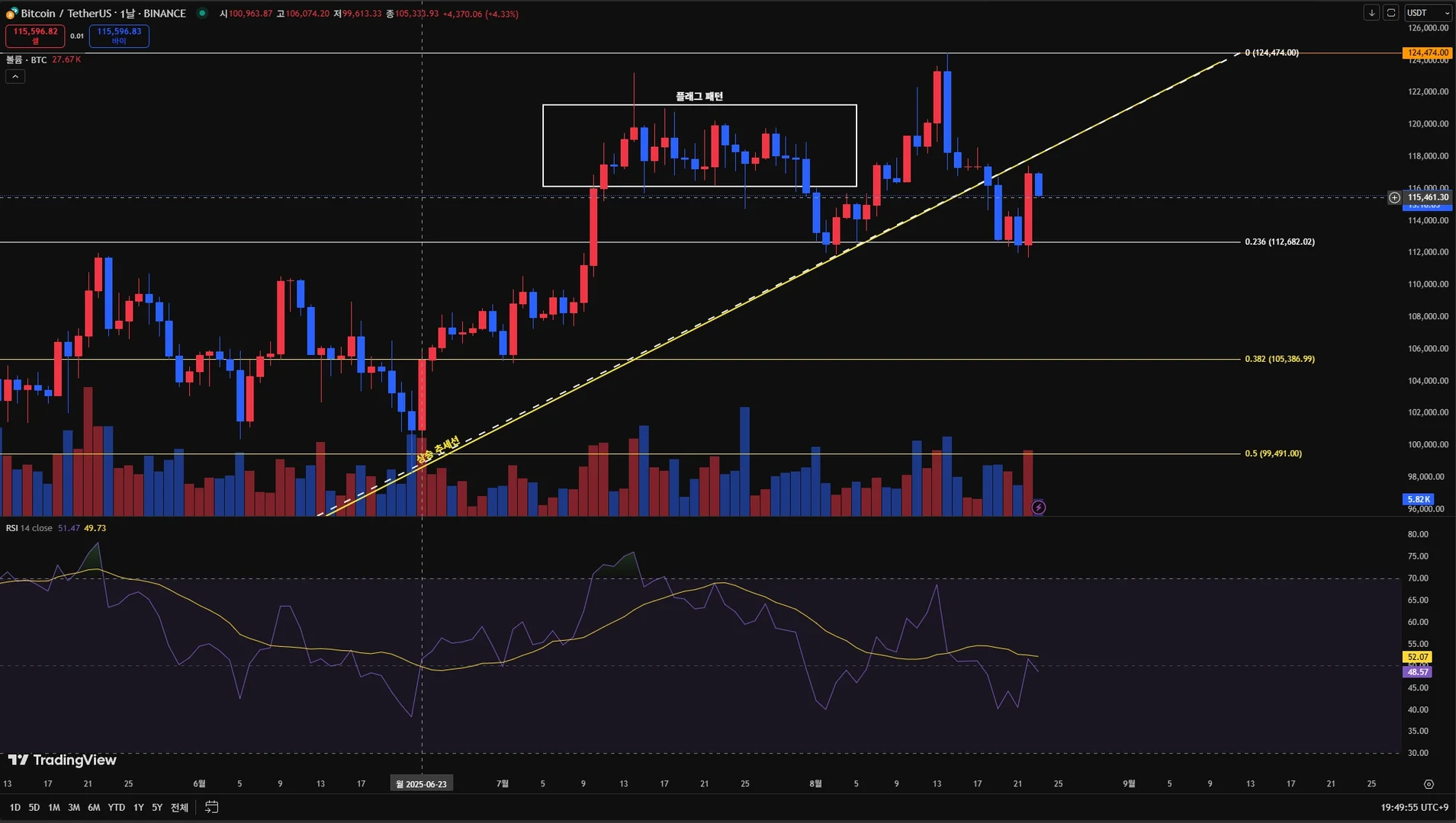 2025년 8월 23일자 비트코인 차트를 활용하여 RSI 지수 미션을 수행합니다.