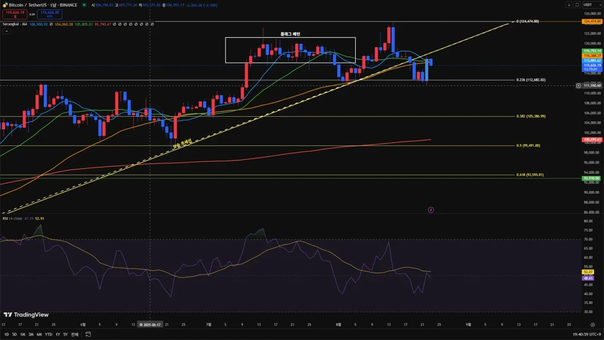 2025년 8월 23일자 비트코인 차트를 활용하여 RSI 지수 미션을 수행합니다.