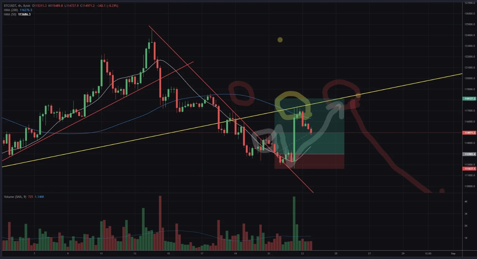 이후 캔들이 노란색 장기 상승 추세선에 닿으면 익절, 붉은색 단기 하락 추세선 아래로 뚫고 내려가면 손절하겠다는 전략으로 진행하였다.