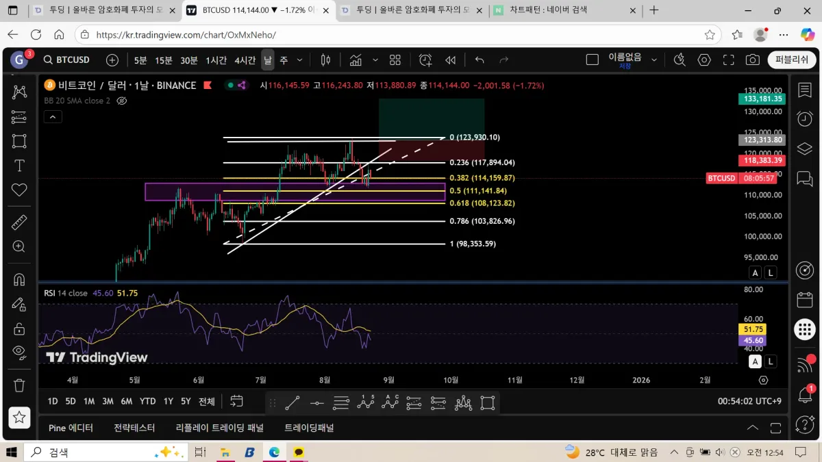 날봉 기준으로 가로선을 박스로 체크하고 피보나치 되돌림으로 저점과 고점을 연결했을 때 박스가 정확히 0.5 구간에 위치하는걸로 봐서 강한 지지구간으로 볼 수 있겠다