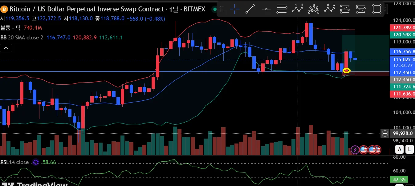 사진에서 노란색 지점쯤에서 볼린저 밴드 아래를 찍으려하기에, (완전히 찍지는 않았지만 거의 찍어서 들어갔습니다.) 아직 까진 상승장이라고 생각하고 올라갈 수 있을 것으로 예측하였습니다.