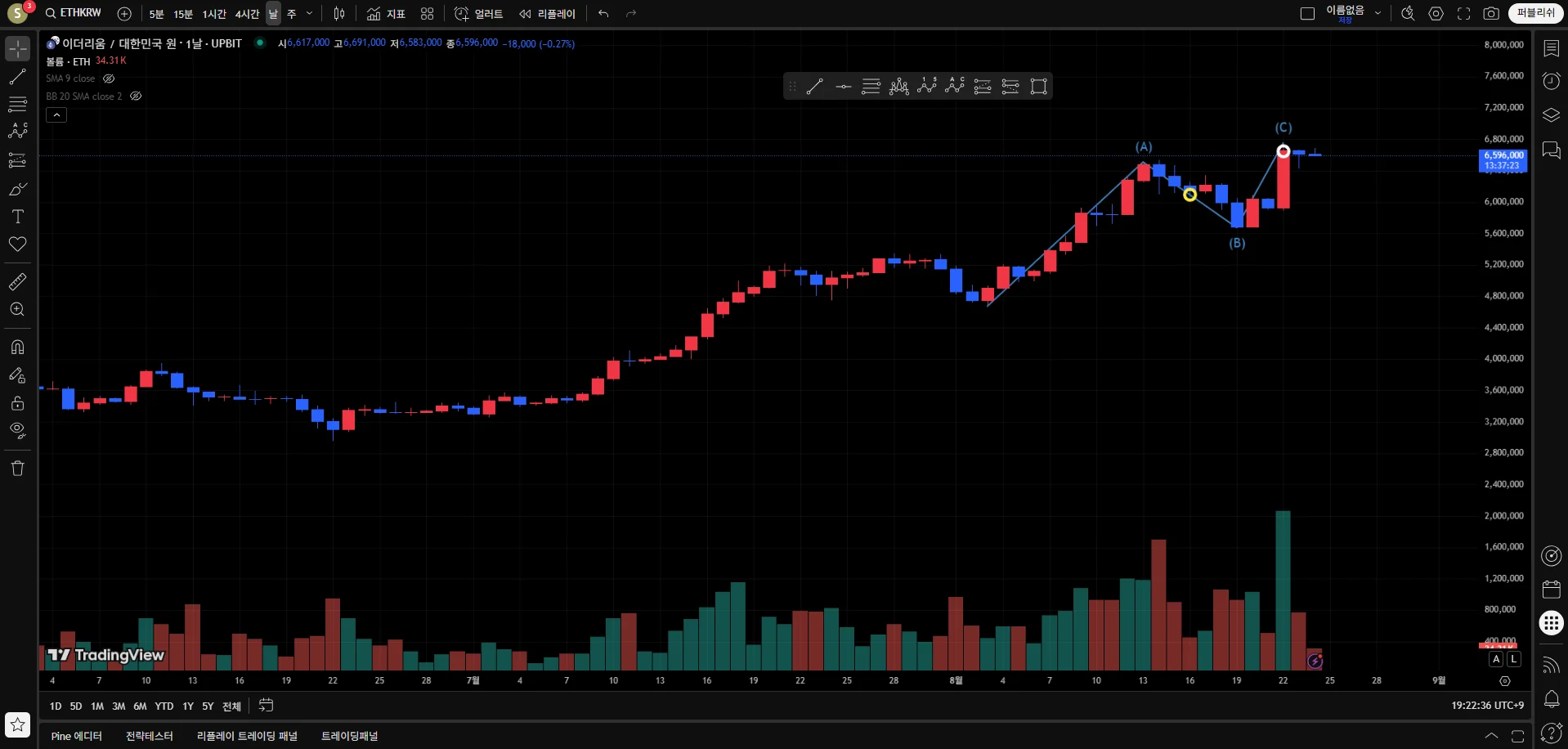 우측 (C)지점이 꼭지라고 생각해서 해당 가격에서 매도했습니다. 약 7.5% 수익을 얻었습니다.