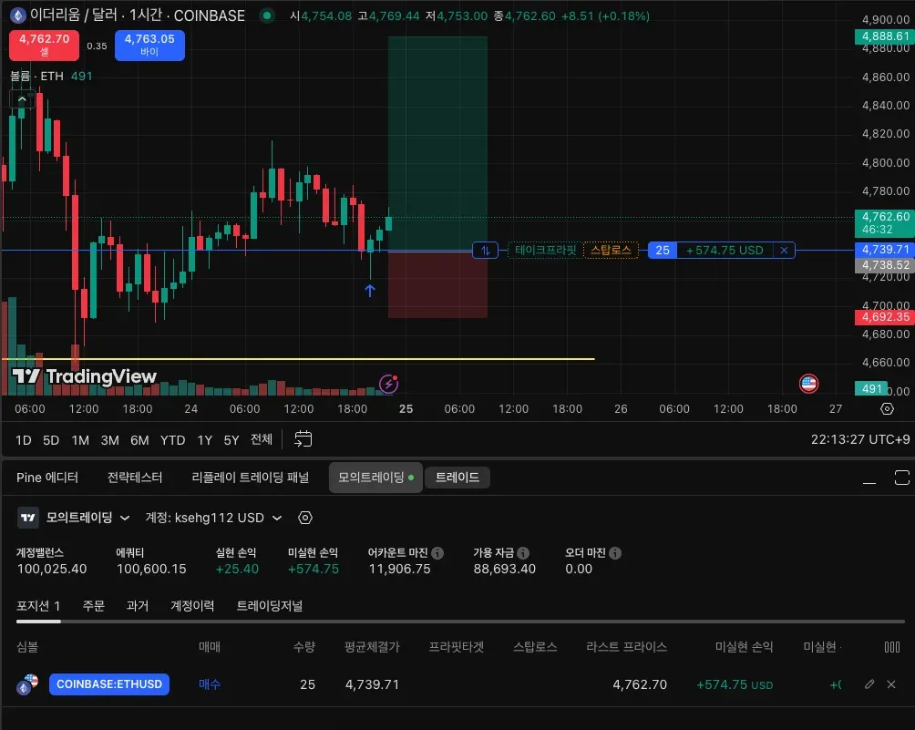 파란 수평선(약 4,739 부근)에서 여러 번 지지를 확인한 뒤 반등.