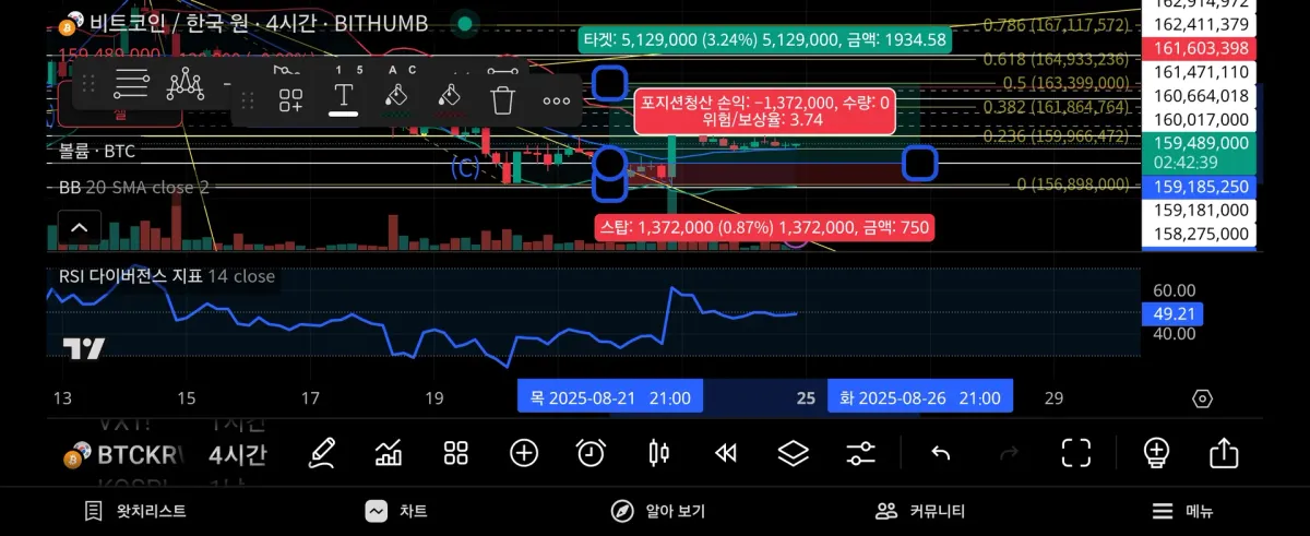 -> 일봉에서 설정한 저항을 넘어서지 못하는 모습을 보여 급한 마음에 피보나치 0.382 부근에서 뇌동매매