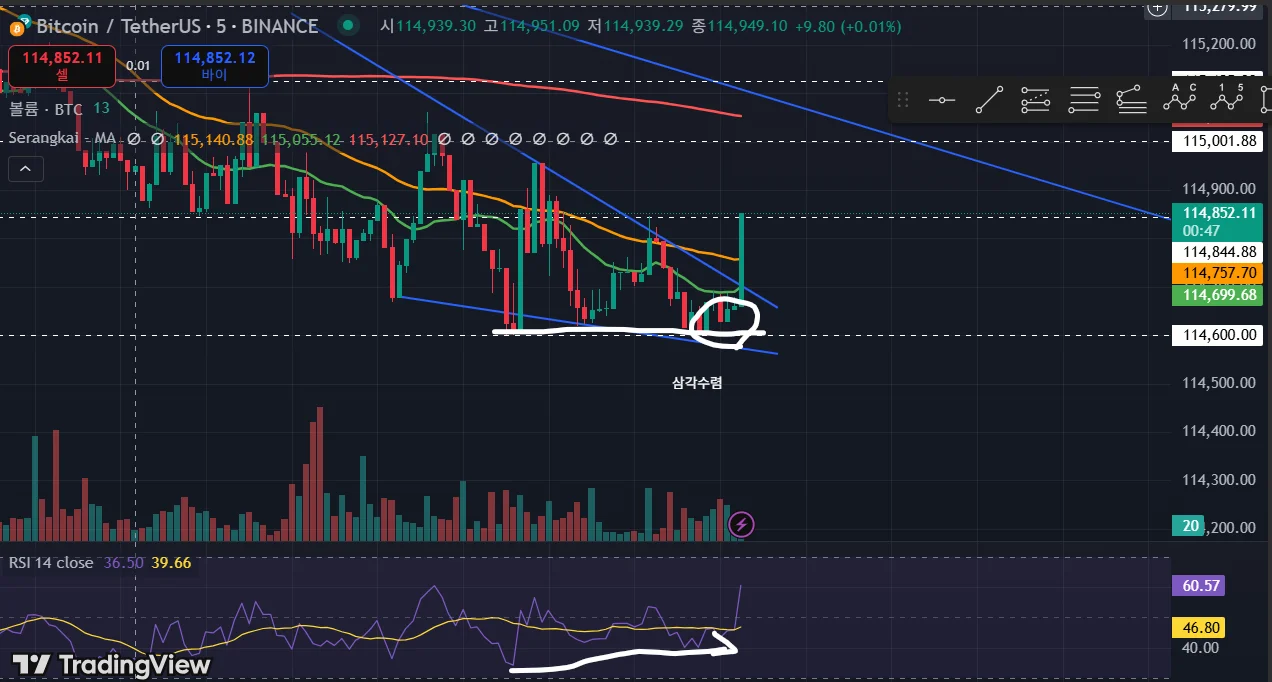 RSI를 보고 RSI는 상승했지만 저점이 비슷한 걸로 보아 상승의 가능성이 있다고 생각했습니다. 삼각수렴 패턴 또한 관찰하였지만, 방향성이 정해지지 않았지만 솔직히 조금 성급하게 매매를 했던 것 같습니다. 하지만 바로 고점 찍는 것을 보고 매도를 하여 이득을 보았지만, 조금 천천히 다음을 지켜보는 여유를 갖는것도 중요할 것 같습니다.