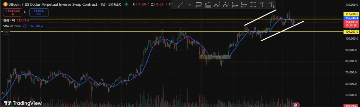 저항을 맞고 떨어진다면 추세를 깰 수도 있음을 염두에 둬야겠다고 생각이 드네요.