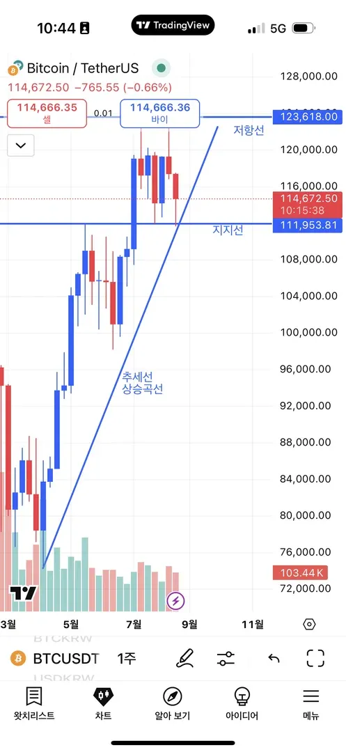 핸드폰에서 트레이딩뷰 어플로 작도해보았습니다