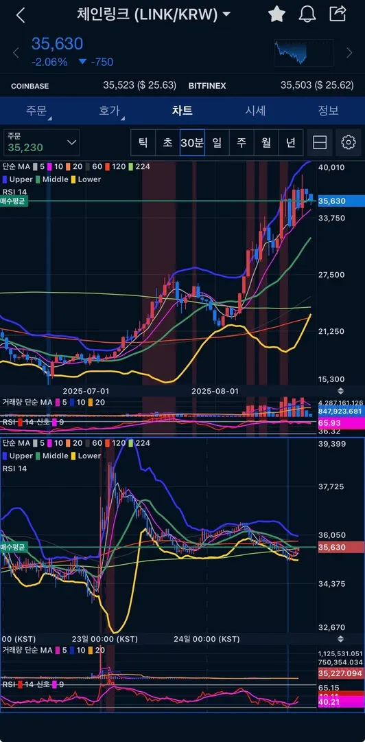 주요 지지선 근처에 가격 (35,630원) 근처라서 여기서 반등 가능성이 있었고,RSI 지표로 과열/과매도 상태에 힘이 빠졌지만 바닥권이라 다시 올라갈 여지가 있어보였으며, 같은 시기 비트코인도 단기 눌림으로 체인링크 단기 반등을 예측 하여 단타로 매수 하였고 35,890원대에 매물대에 하락이 보여 매도 하였습니다.