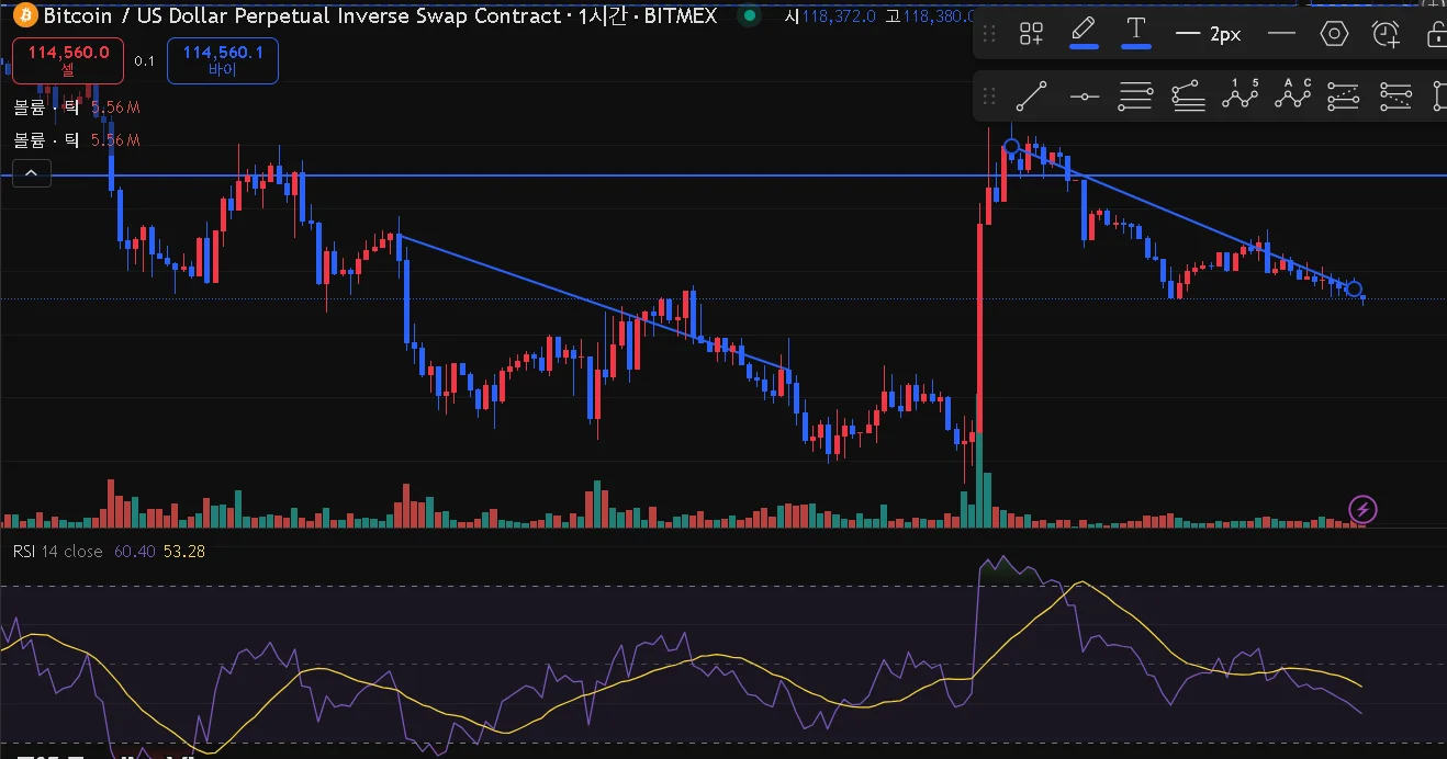 다음의 차트를 분석해 보면 급등 후 가격은 서서히 감소하기 시작했고 거래량도 줄어들기 시작했다. 그리고 rsi지표는 감소하고 있다.