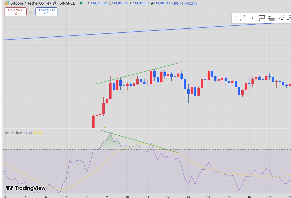 가격은 상승하지만 rsi가 낮아지며 결국 가격이 하락