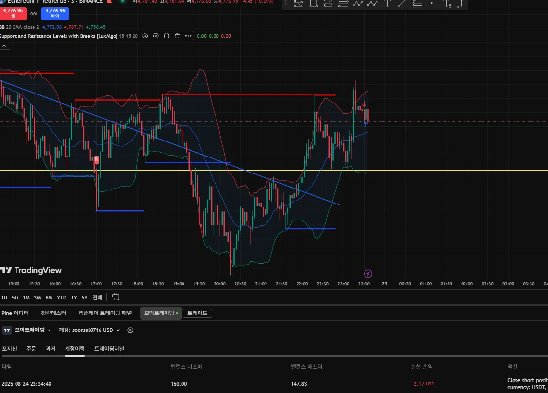 오늘 하락 추세를 만들다가 급등후 저항선을 맞고 하락하는 것을 보고 숏을 치고 심법이 부족해서 손절 했네요