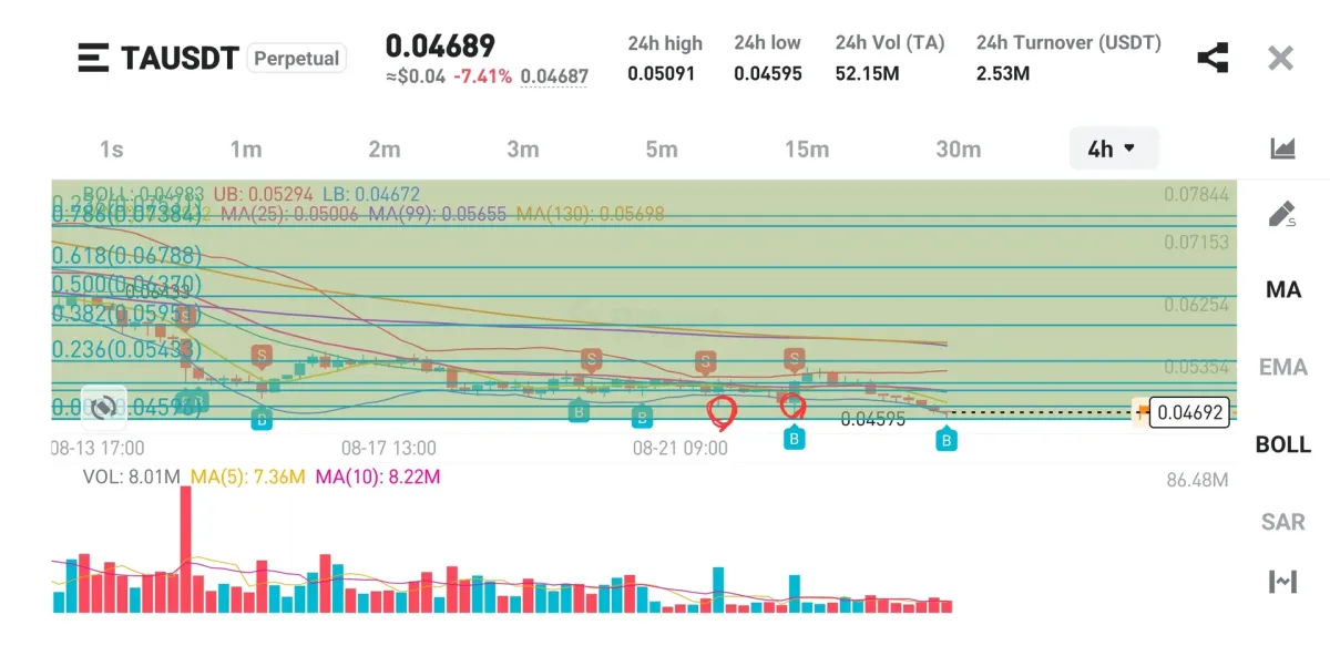 최고점에서 70% 이상 하락한 0.4756의 최저점은 지키고 상승력이 있다고 생각 0.0478에 진입하고 피보나치 첫 저항점까지 상승을 보았으나 잭슨홀 파월연설전 급변동에 손절가 세팅에 의한 손절발생.