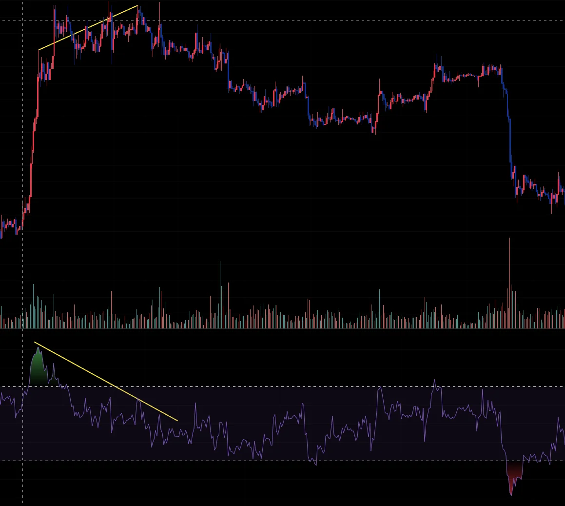 고점 도달로 인한 매수세 하락 하지만 주가는 추가 상승 후 횡보 후 하락