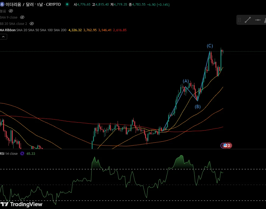 RSI 지수가 과매수 조정 후 다시 반등하는 흐름을 보였고, 중기 이동평균선 위에서 안정적으로 지지를 확인함. 엘리엇 파동 관점에서도 3파 진행 가능성이 열려 있어 추가 상승 여력이 있다고 판단함. 또한 최근 상승 구간에서 거래량이 동반 증가하며 매수세가 유효함을 뒷받침한다고 봄