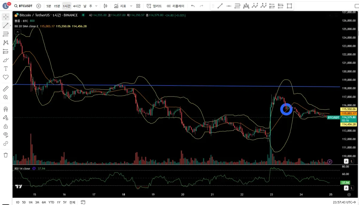 리테스트 구간인 이전 매물대 114.5~8사이 20이평 닿을 때 롱포지션 5배 진입