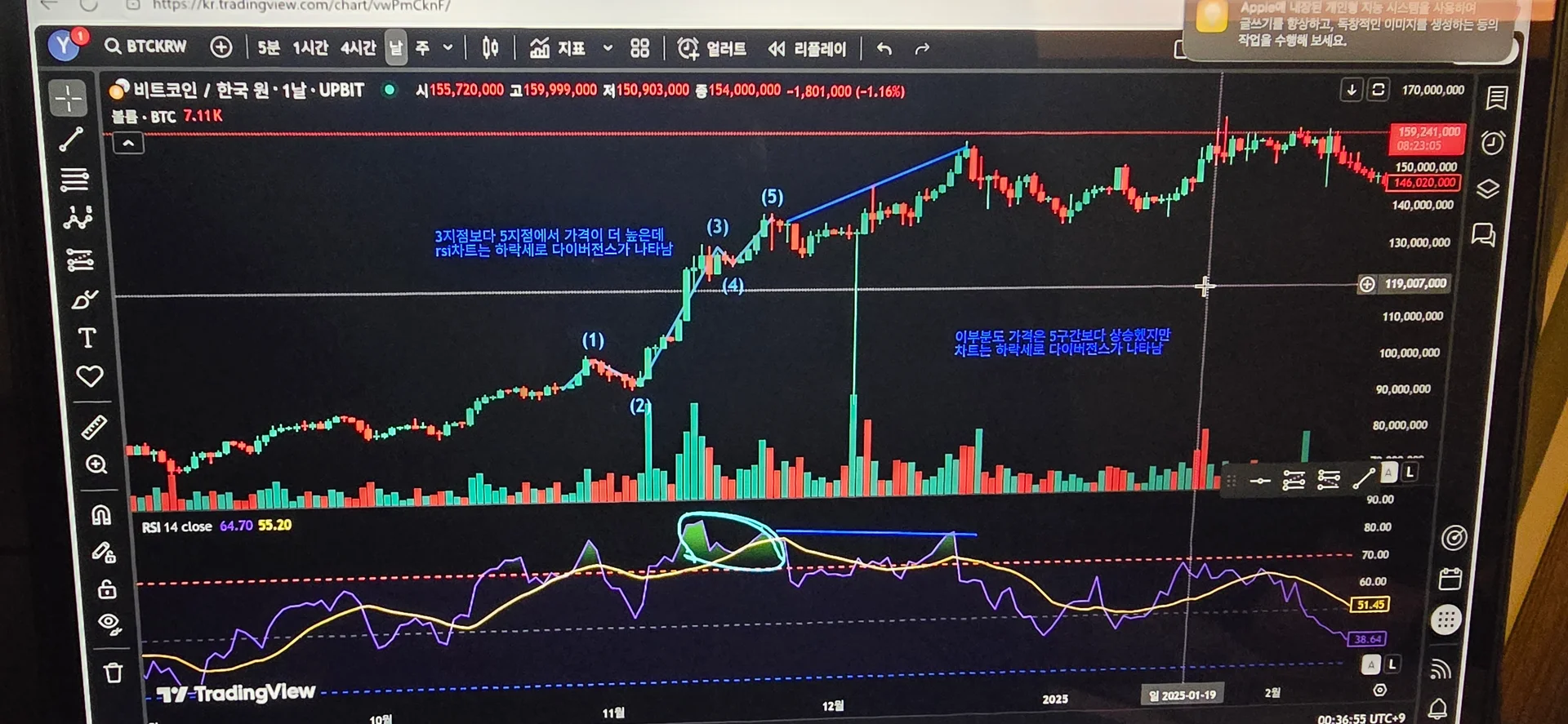 임펄스 파동을 그어봤을때 3지점 보다 5지점이 더 가격이 고점인데도 RSI 차트는 반대로 가고 있음. 다이버전스가 나타남.