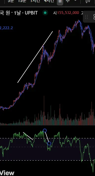 캔들 차트는 상승하고 있으나, RSI 차트는 하락하고 있는 <하락 다이버전스> 패턴입니다.