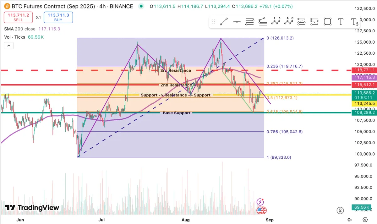 먼저, 선물 매매를 주로 하고, 현물 매매는 현재로선 할 생각이 없기 때문에 선물 차트를 사용하였습니다. 강사님께서 미션 내려주신대로 확인한 지지선들과 저항선들을 작도하였고, 피보나치 되돌림을 통하여 저의 작도의 신뢰성을 높였습니다. 스윙매매의 관점으로 접근하여 4시간 프레임을 사용해 중장기적인 차트의 움직임을 예측하려 하고 있습니다만, 초록색과 자주색의 하락 추세선이 옳게 작도된지에 대한 의문은 남습니다. 또한, 1차 지지 (0.618)까지 차트가 내려온걸 확인하였고, 이 시점에서 반등한걸 보아 단기적인 상승은 예상할수 있었고, 실제로 반등은 일어났습니다 (작도 자체는 며칠 전에 하였습니다). 그리고, 지지선이 무너져 저항선으로 전환, 이후 리테스트 후에 다시 한번 지지선이 된거로 확인이 되는데, 이 사고방식이 올바른지에 대한 궁금증이 듭니다. 더블 탑 패턴도 관찰이 되었는데, 넥라인이 피보나치 되돌림의 0.5레벨에서 관찰이 되어 이 레벨에 대한 중요성이 다시 한번 확인이 되었습니다 (패턴, 넥라인, 피보나치). 이 레벨이 중요한 역할을 할것으로 예상이 되고, 마지막 자주색 추세선을 돌파하며 상승을 보일지, 아니면 이미 한번 넥라인 밑으로 떨어졌다가 올라왔기 때문에 리테스트 일지는 모르겠습니다. 확실한 리테스트가 일어나야 더블탑도 확정지을수 있겠네요. 더블탑에 대한 확정도 돌아보니 너무 성급했습니다.. 더 시간을 두고 지켜본 후에 매매 방향을 결정할수 있을거로 생각됩니다. 현재 챕터 2만 수강했기에 보조 지표를 사용하지 않았고, 각 이론들에 대한 전문성이 떨어지다 보니 저의 분석이 현재로선 오류가 많은것 같습니다. 부족한 점이 정말 많다는걸 실감하게 되네요. 불과 며칠 전까지만 해도 차트 분석에 대해 전혀 몰랐었기에 앞으로의 여정이 더욱 기대됩니다.