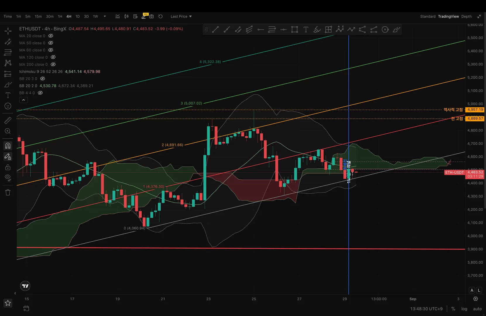 볼린저밴드, EMA, 일목구름표, RSI, 거래량을 사용합니다.