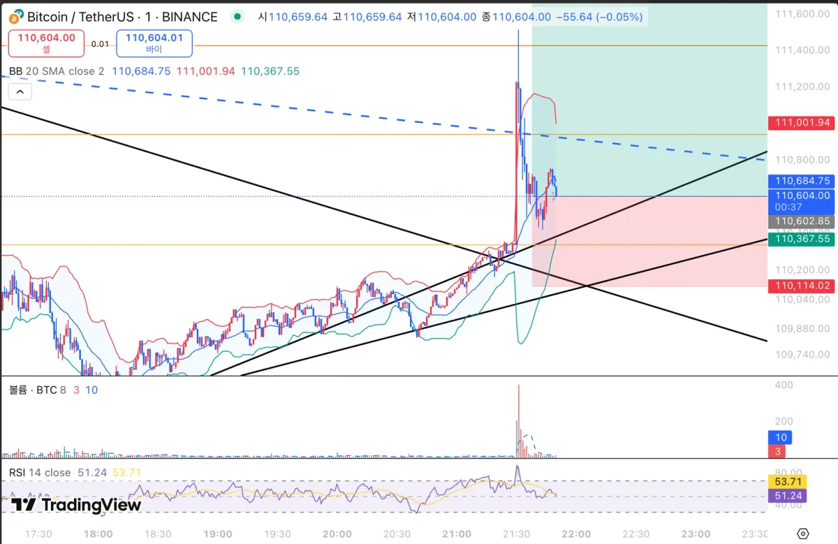 - 1분봉으로 보았을 때 크로스 되어있던 추세선을 거래량이 붙으며 돌파하는 모습을 확인하였습니다. 이때 볼린저 밴드의 중심선에서 위로 캔들이 형성되었습니다. ( 롱 포지션 대기 )