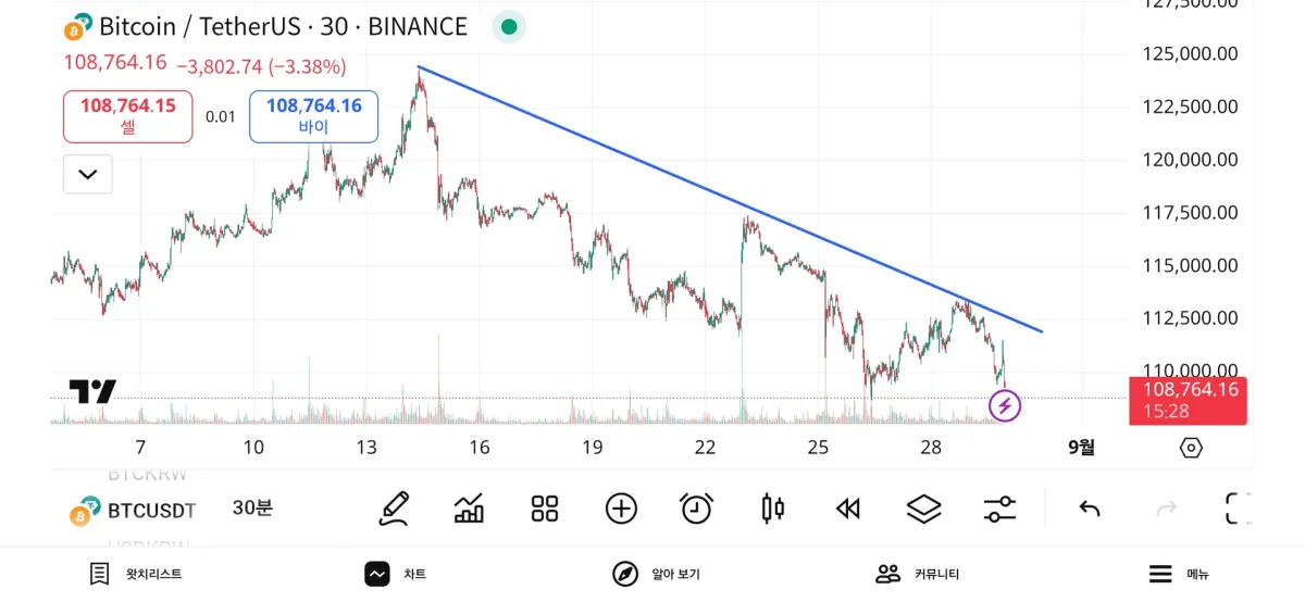 하락 추세선도 그어보았습니다만, 여기선 저항선을 어디에 그어야 할지 모르겠습니다..