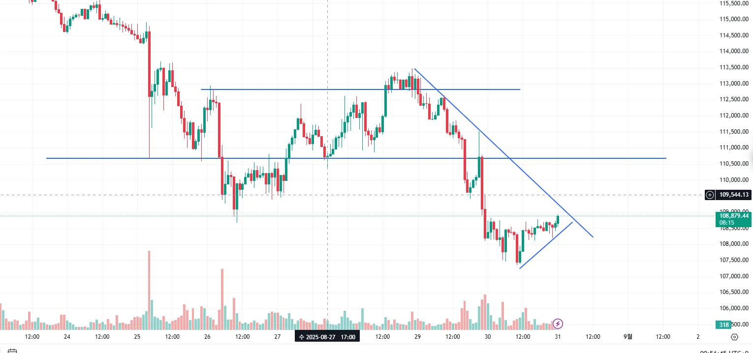 조금 장기적으로 1시간 봉 기준으로 그려보았습니다. 지지 저항, 하락 추세와 약한 상승 추세선을 그려보았는데 이렇게 하는건지, 잘 모르겠지만 일단 보이는대로 그려보았습니다.