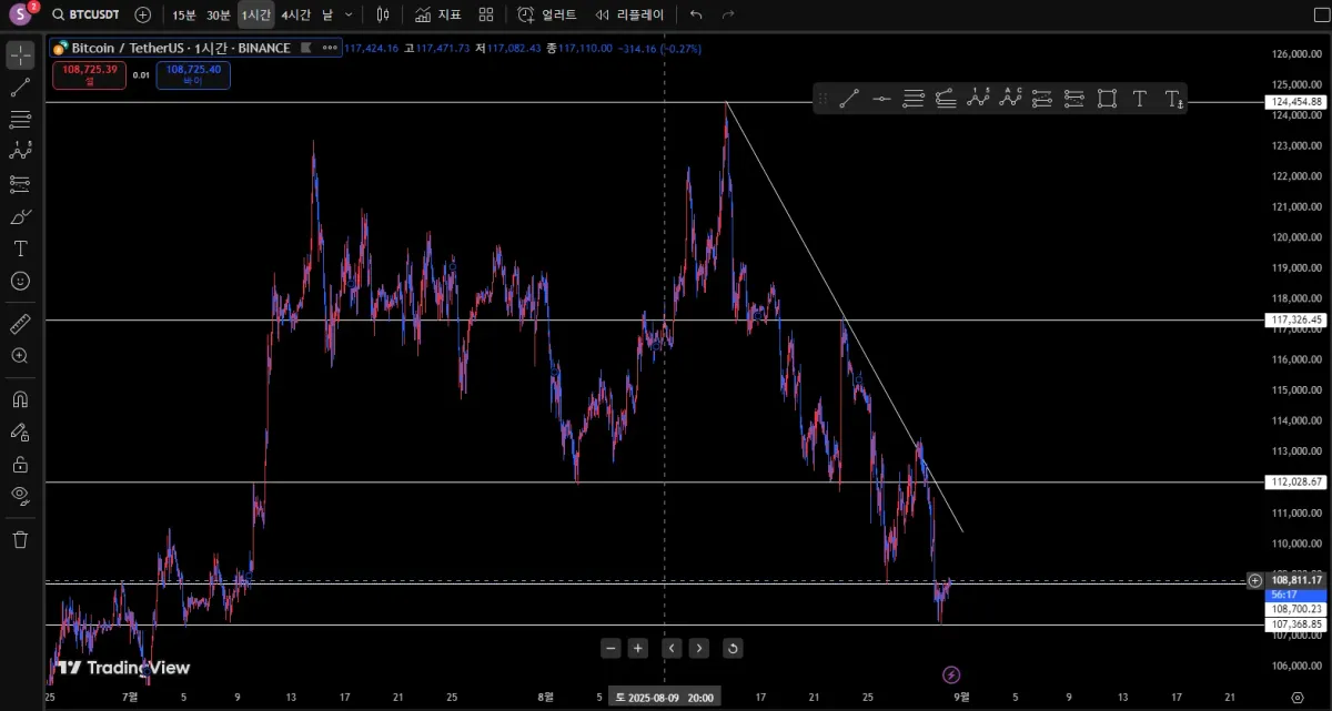 시간이 조금 더 지나 하향 추세선과 차트가 만나거나 하단 지지선을 돌파하는 시점에 , 숏 포지션으로 진입하면 조금 더 확실하지 않을까 생각 듭니다.