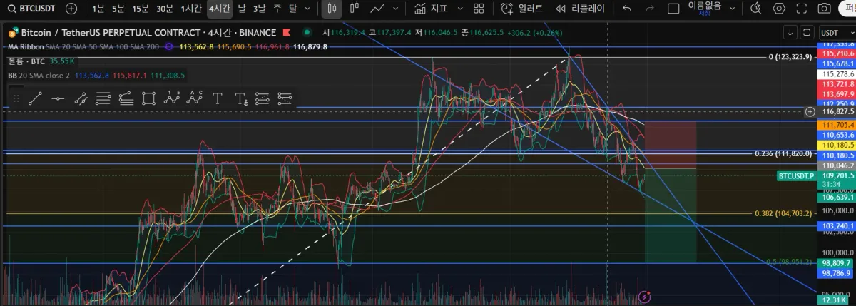 현재 상승추세였던 비트코인이 하락추세로 바뀐걸 보았고 더블탑 패턴이보여 넥라인을 돌파하고 리테스트를 주고 더 하락할것으로 예상따라서 현재 단기로 상승중인 비트코인이 진입가에 닿으면 숏포지션을 잡아 피보나치 0.5 지점까지 내려갈것으로 예측했습니다