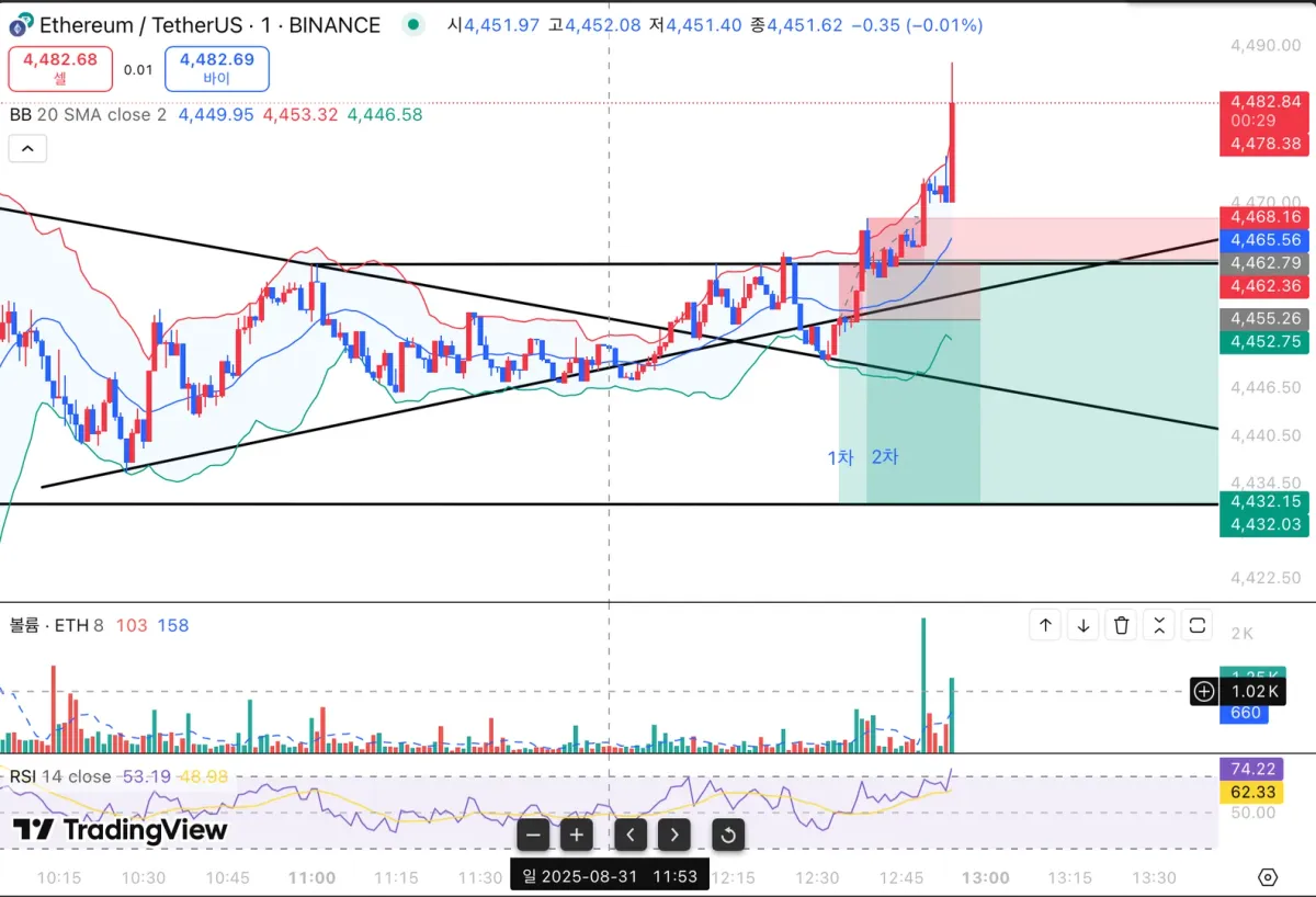 - 1차 매수는 저항선에서 리테스트를 하는 곳으로 보이는 위치에 포지션 진입 손절은 아까 넘기지못한 매물대로 손절 라인 잡음 ( 1차 손절 )