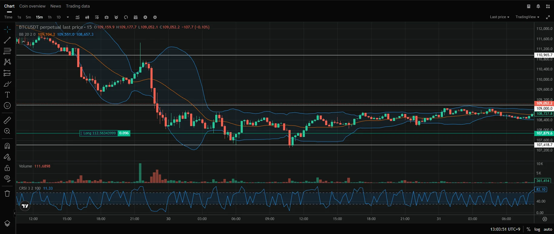 지속적인 횡보를 하던 중, 볼린저밴드를 이탈하는 순간을 봤고, 각 볼린저 밴드 하방 이탈 시에, 추가 매수 2차례 진행. 평단가 107.4k, 현재가 109k로 수익중인 포지션입니다. 조금 더 오를 것이라 생각해, 매도는 아직 체결하지 않았습니다.