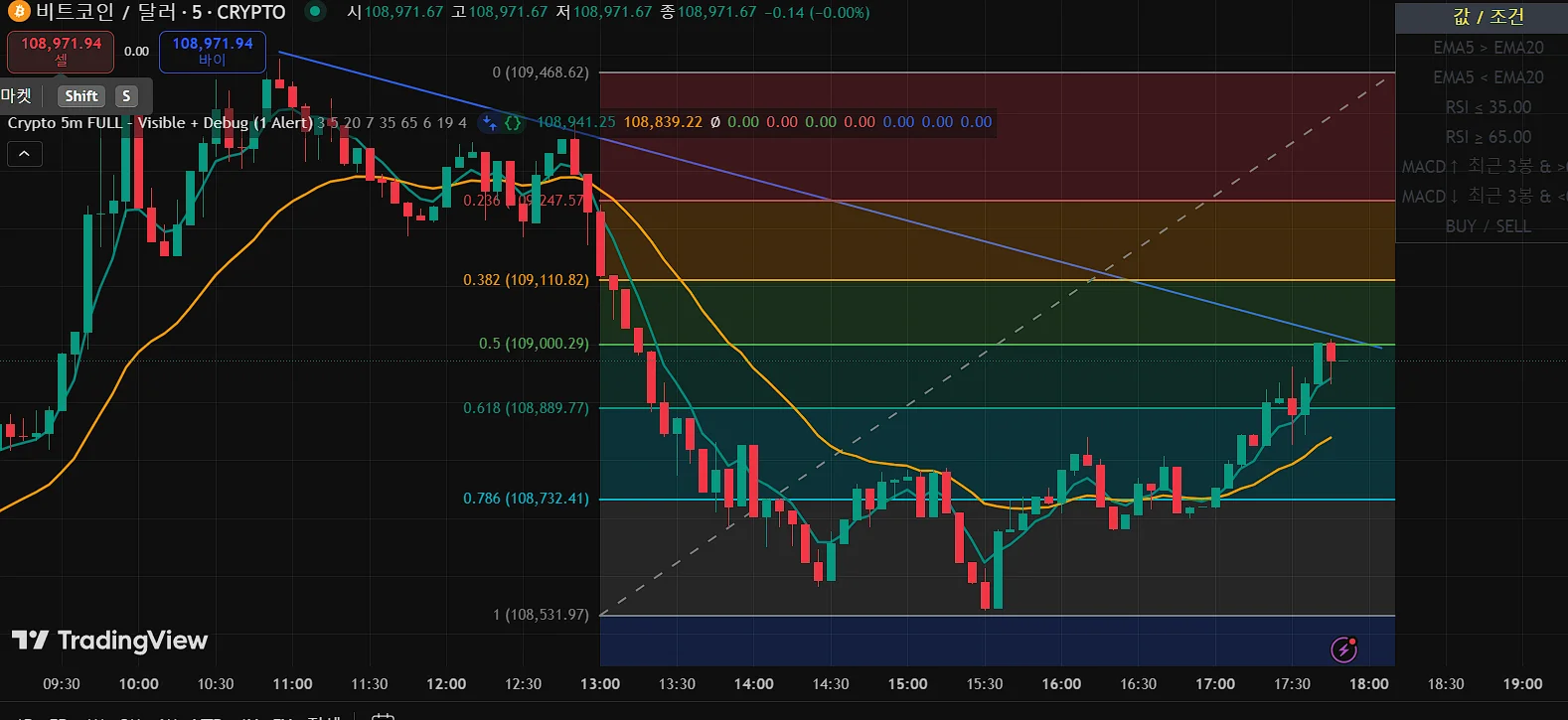예습하는 마음으로 이것저것 만져봤습니다. 5분종 기준 상승추세로 해석됩니다.