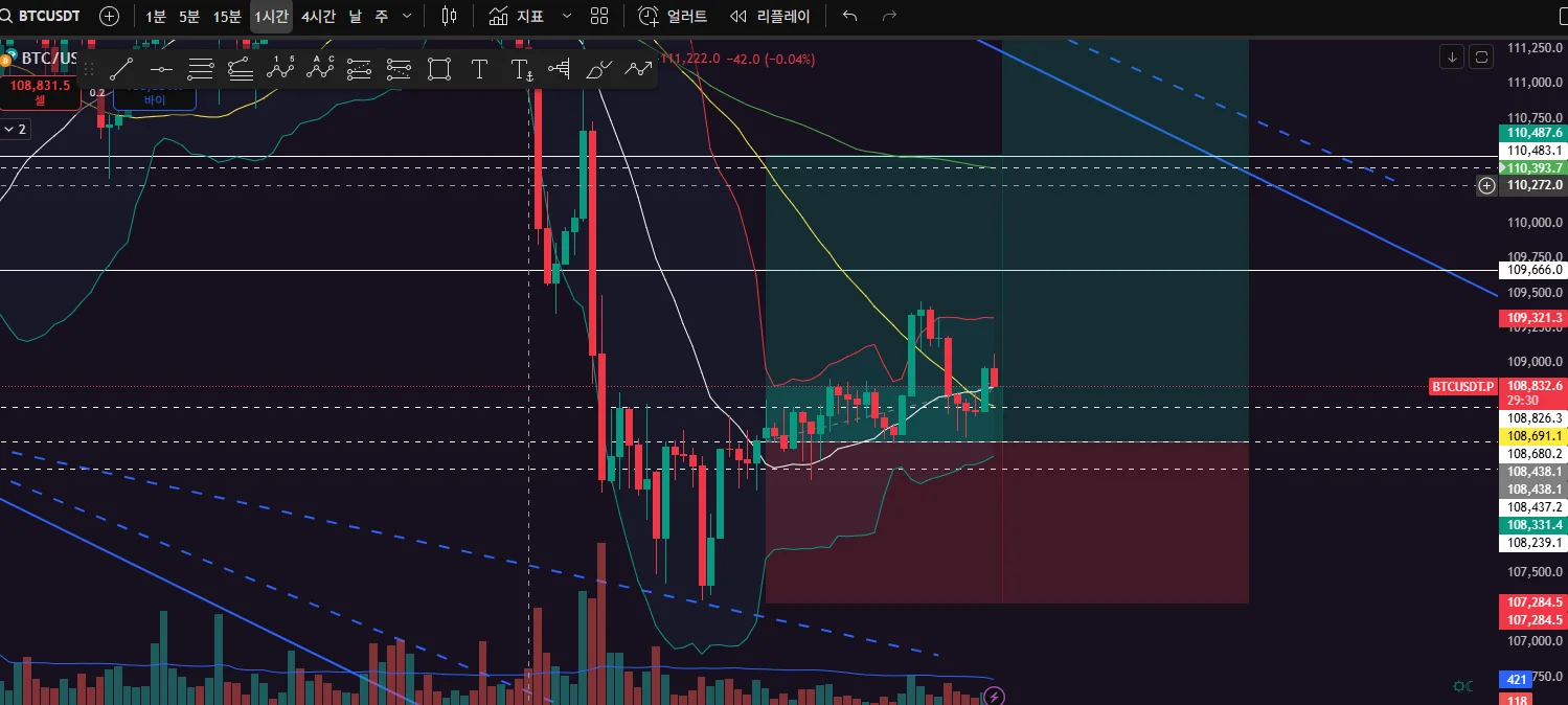 투딩 강의에서 본 분석을 토대로 배운것을 활용하여 지지/저항, 추세선, 다우이론 이 세가지를 활용하여 날봉, 4시간봉, 1시간봉 순으로 분석했습니다. 장기적으로는 상승추세가 아직 꺾이지 않았다고 판단하였지만 단기적으로는 아직 하락추세가 계속된다고 생각하였고 1시간봉 기준으로 새로운 저점을 형성하고 올라오는 도중에 저항을 몇 번 맞았던 108.7k부근을 뚫었다고 생각이 들고 RSI지표와 아직 하락 채널의 상단까지 많이 남아있다는 근거를 들어서 롱포지션에 진입하였고 손절가는 전 저점으로 잡고 익절가는 일단 110.4k로 잡았지만 계속 지켜보다가 하락 채널 상단 부근과 그어놓은 저항선에 가깝다고 생각이 들면 반익절 후 지켜볼 것 같습니다. 현재 시간으로 약 4퍼 정도 수익보고 있습니다.