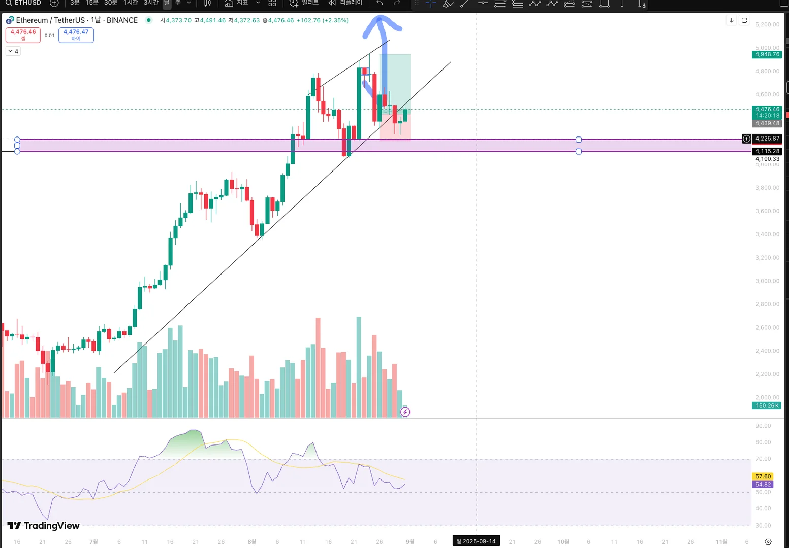 이더리움 차트를 보고 소액으로 롱 진입해봤는데 상승하다가 목표가까지 도달하기 전에 하락추세로 바뀌어 중간에 급하게 익절했습니다.