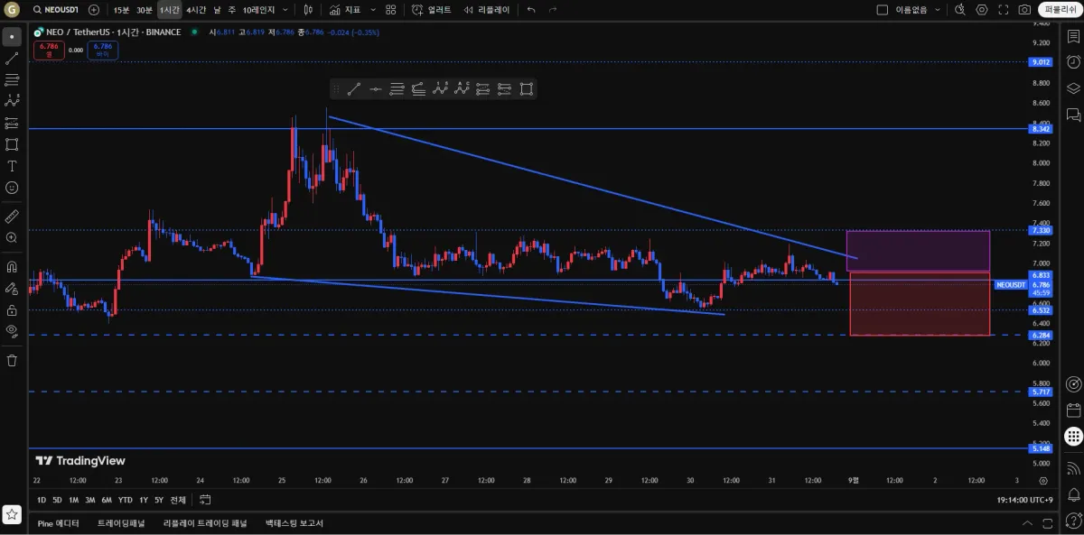 하락 삼각추세를 보이고 있음. 바이비트에 모의투자를 통해 6.8달러에 14.7개 숏포지션으로 진입
